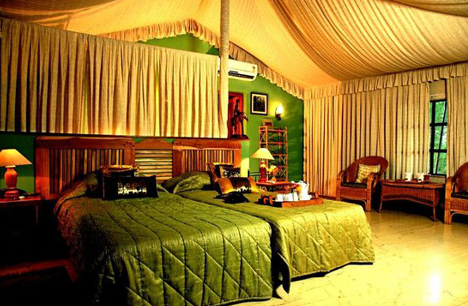 Super deluxe & deluxe models are available to attract the guests towards your resort. It is a single pointed pyramid shaped tent fixed on printed concrete plate form, which has four layers of fabric (UV shade fly, PVC fabric, Polyester Canvas and lastly gorgeous printed fabric). Deluxe safari tents equipped with all the modern facilities like Air Conditioning, a king size bedroom, refrigerator, luxurious bathroom, storage area and sit-out verandah. Tents are spacious and tastefully done up with Neo-ethnic interiors, beautiful furnishing and cozy lighting.